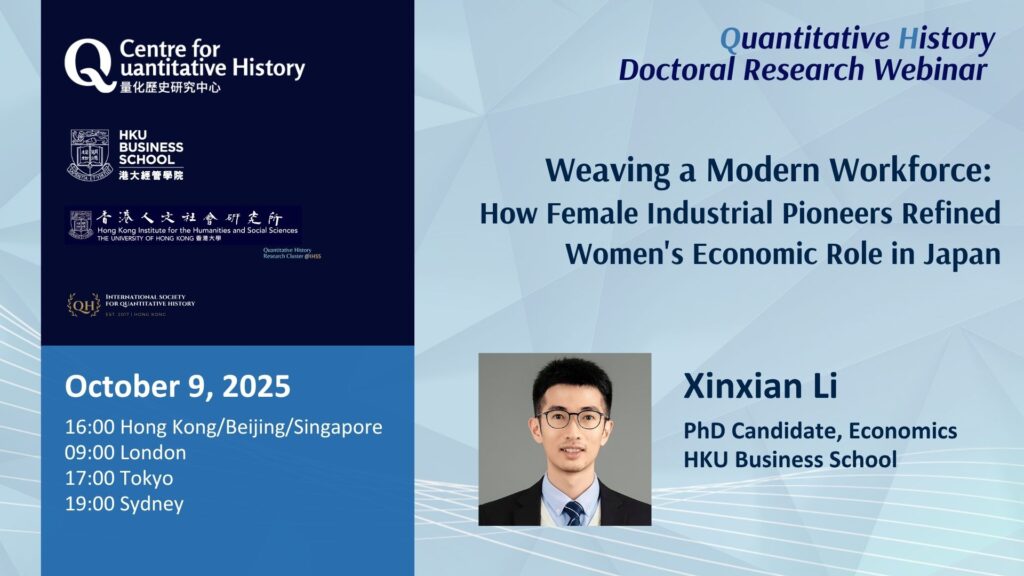 Early industrialization created a tension between new economic opportunities and traditional social norms that confined women to the domestic sphere. Xinxian Li, Research PhD Candidate of HKU Business School, examines how female industrial pioneers helped mediate this tension by prompting more women to participate in factory employment during the early industrialization in late 19th to early 20th century Japan. The female industrial pioneers emerged in the first modern model factory, Tomioka Silk Mill, thanks to the French technology transmission in 1872. Xinxian finds that these pioneers catalyzed their home regions’ female labor force participation by 1920. And this effect is not confined to silk industry but spilled over to other public sectors. As a placebo, the pioneers did not affect female workforce in the traditional agriculture. During this Quantitative History Doctoral Research Webinar, he will further elaborate that the pioneering effect arises from two mechanisms: one is that the pioneers diffused new technical skills that nurtured more factory jobs for women, and the other is they acted as role models that encouraged more females to work outside the home. These role models cast a long-lasting impact that extends to contemporary times. Their home municipalities still witnessed higher female labor force participation and more favorable social attitudes toward women than the other areas by 2000.